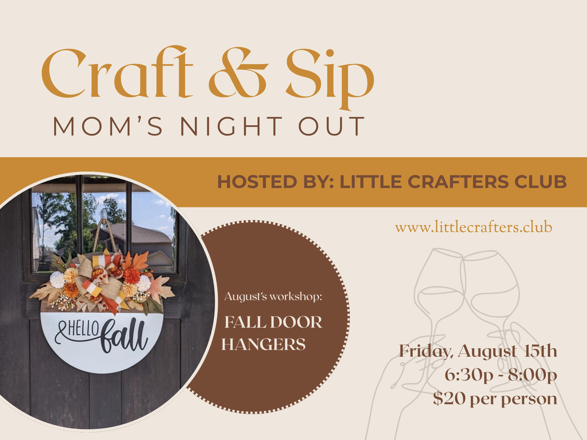 Moms, this one's for you! Enjoy a quiet night out on your own or bring your friends and make it a girl's night! This month, we'll be making fall door hangers just in time for the weather to start cooling down. All supplies are included. This is a BYOB event.