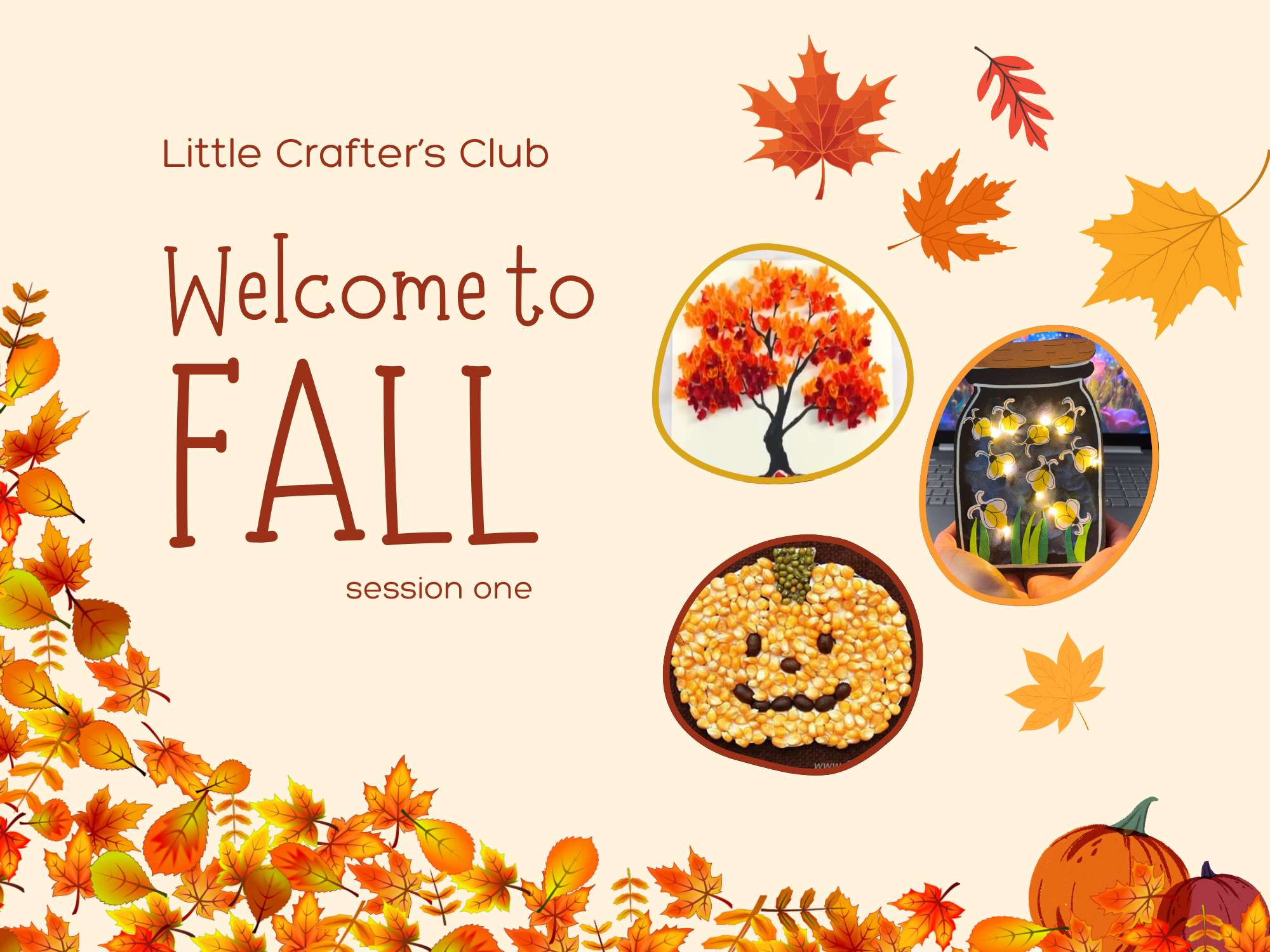 This bundle of classes includes all 5 of the Welcome to Fall Session 1 classes at a discounted bundle rate for crafters ages 4-10. Crafters will enjoy 5 weeks of fall themed crafts: Leaf Suncatchers, 3D Fall Trees, Firefly Jars, Seed Jack-O-Lanterns, and Pinecone Creatures! Grab a spot today! Due to limited space, this is a drop-off class.