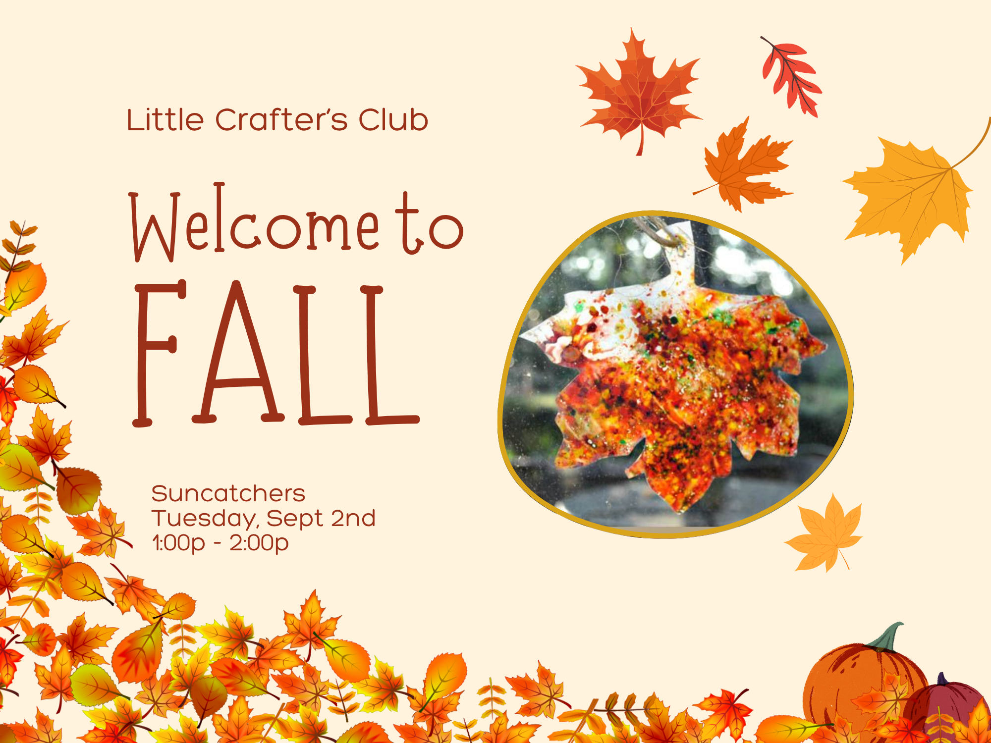 In this class, crafters will create fall suncatchers to hang in the windows at home! Due to limited space, this is a drop-off class for crafters ages 4-10.
