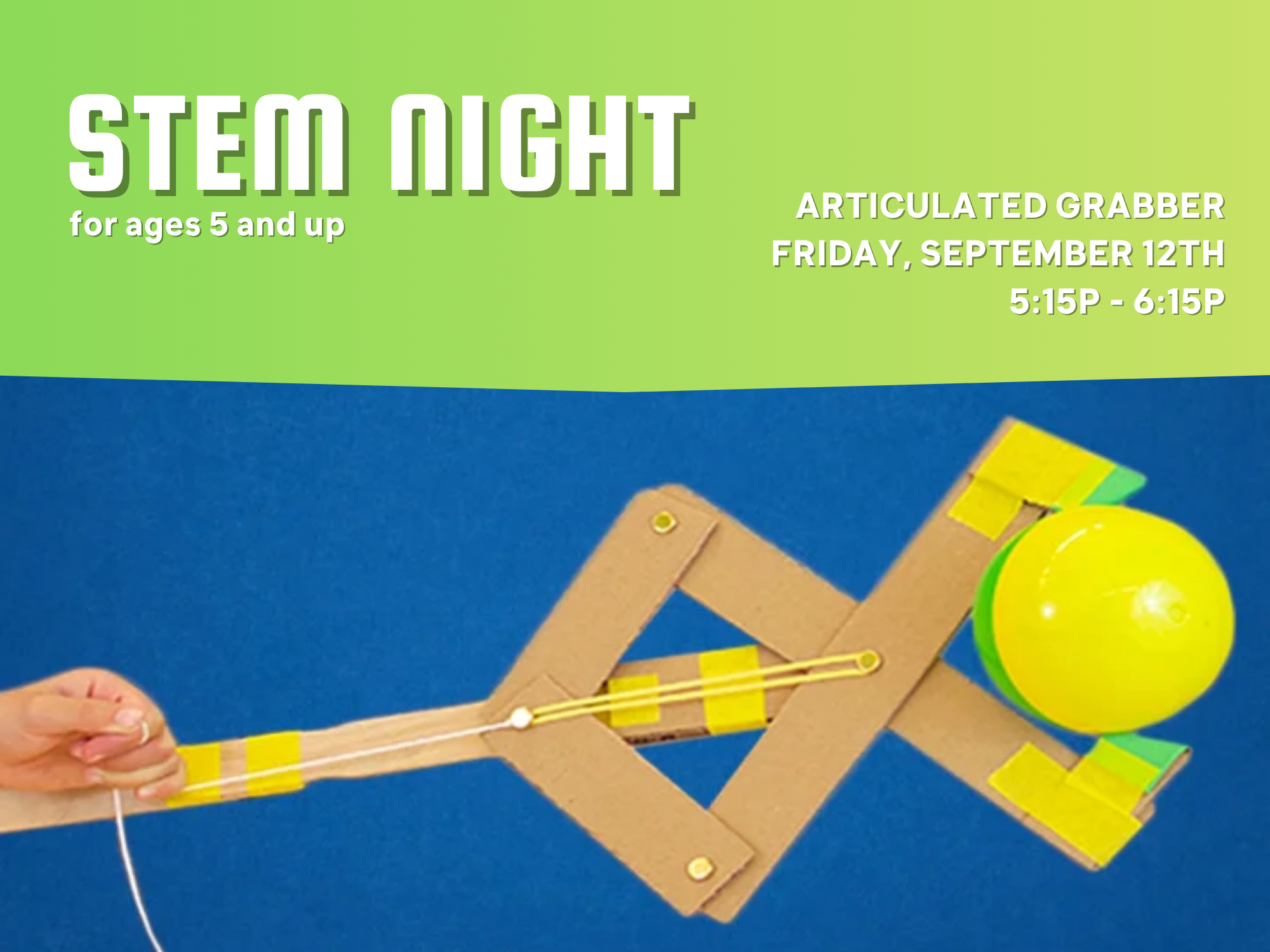 During STEM Night, your crafter will create a craft they can put to good use! This week, we are building articulated grabbers. Crafters will get to experiment with different grabbing mechanisms and see which works best to pick up 4 different objects. Due to limited space, this is a drop-off class for crafters ages 5+.