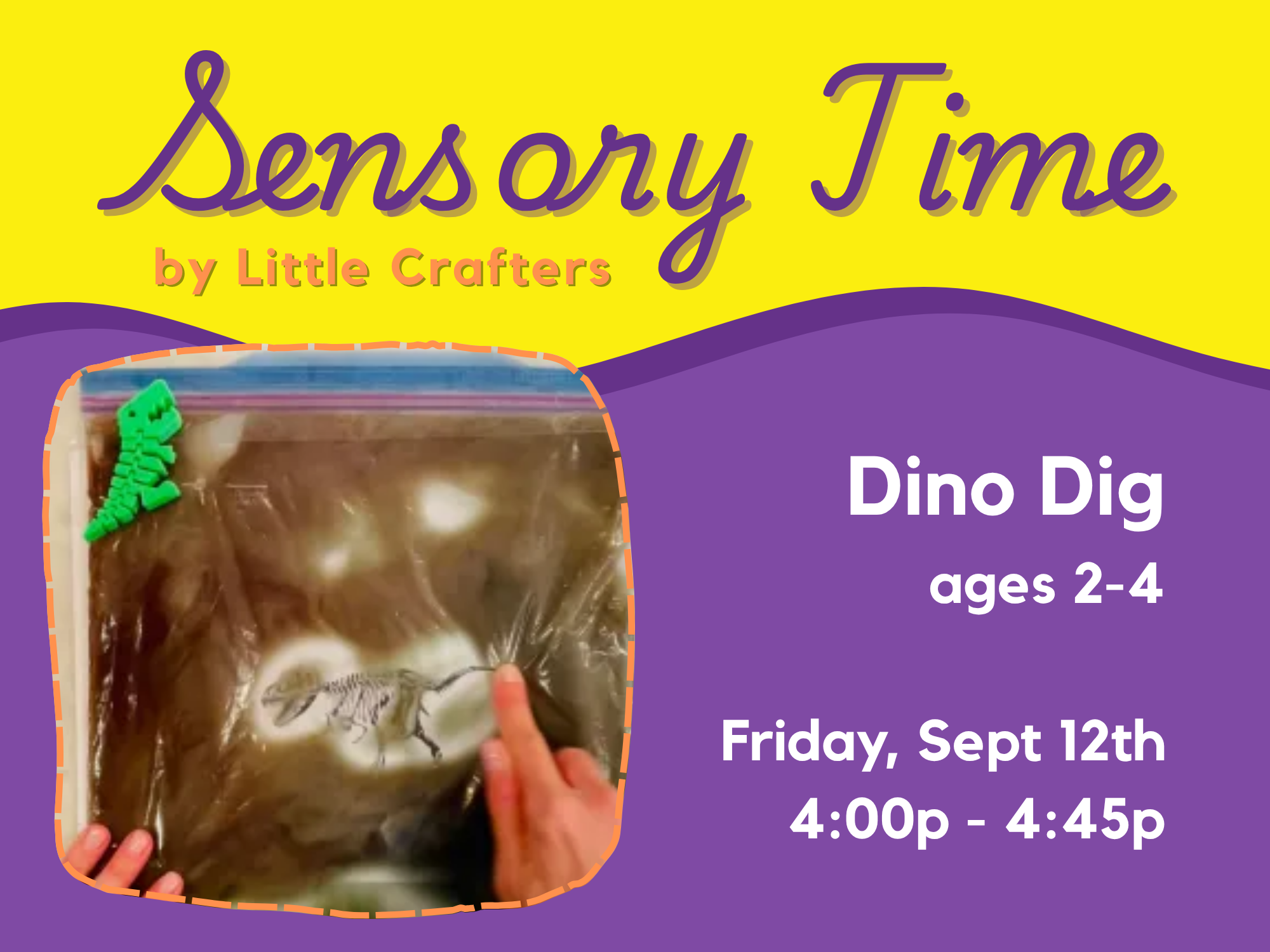 Come enjoy some dinosaur-themed sensory play with your little crafter! Together, we'll assemble a fun dinosaur dig sensory craft to enjoy during class and take home for more fun! This class is for crafters ages 2-4.