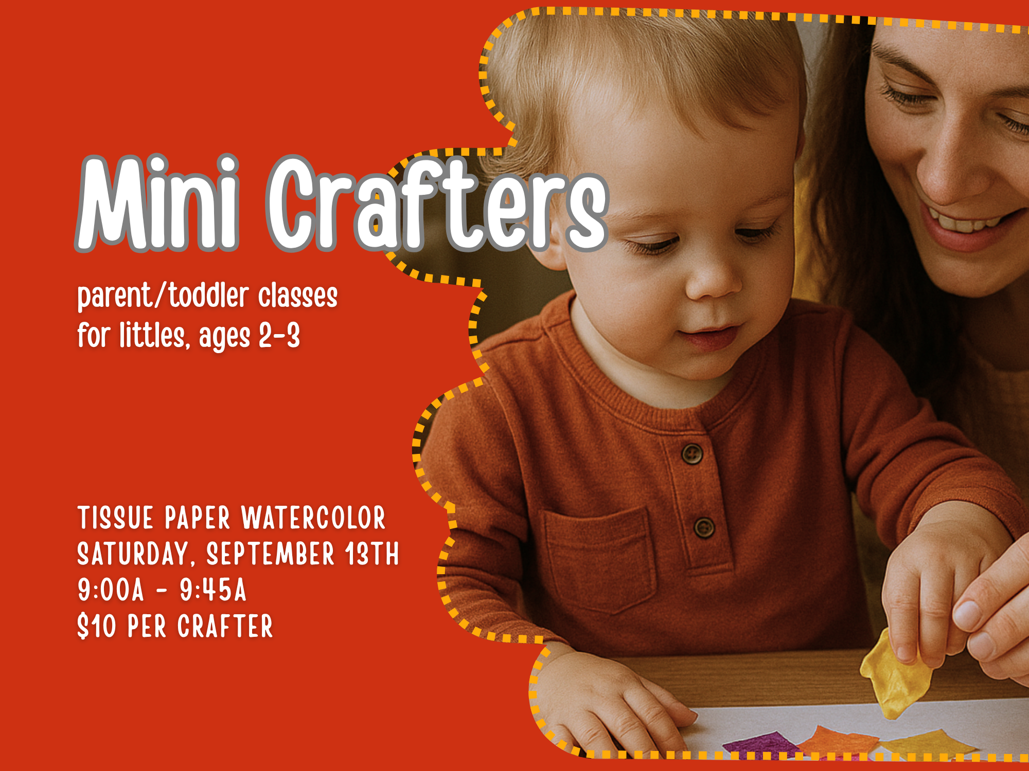 Looking for some bonus time with your littlest crafter, minus the cleanup? Look no further than our fun tissue paper watercolor painting class! Crafters can experiment with patterns, color mixing, or just messy fun! This class is aimed at crafters ages 2-3.
