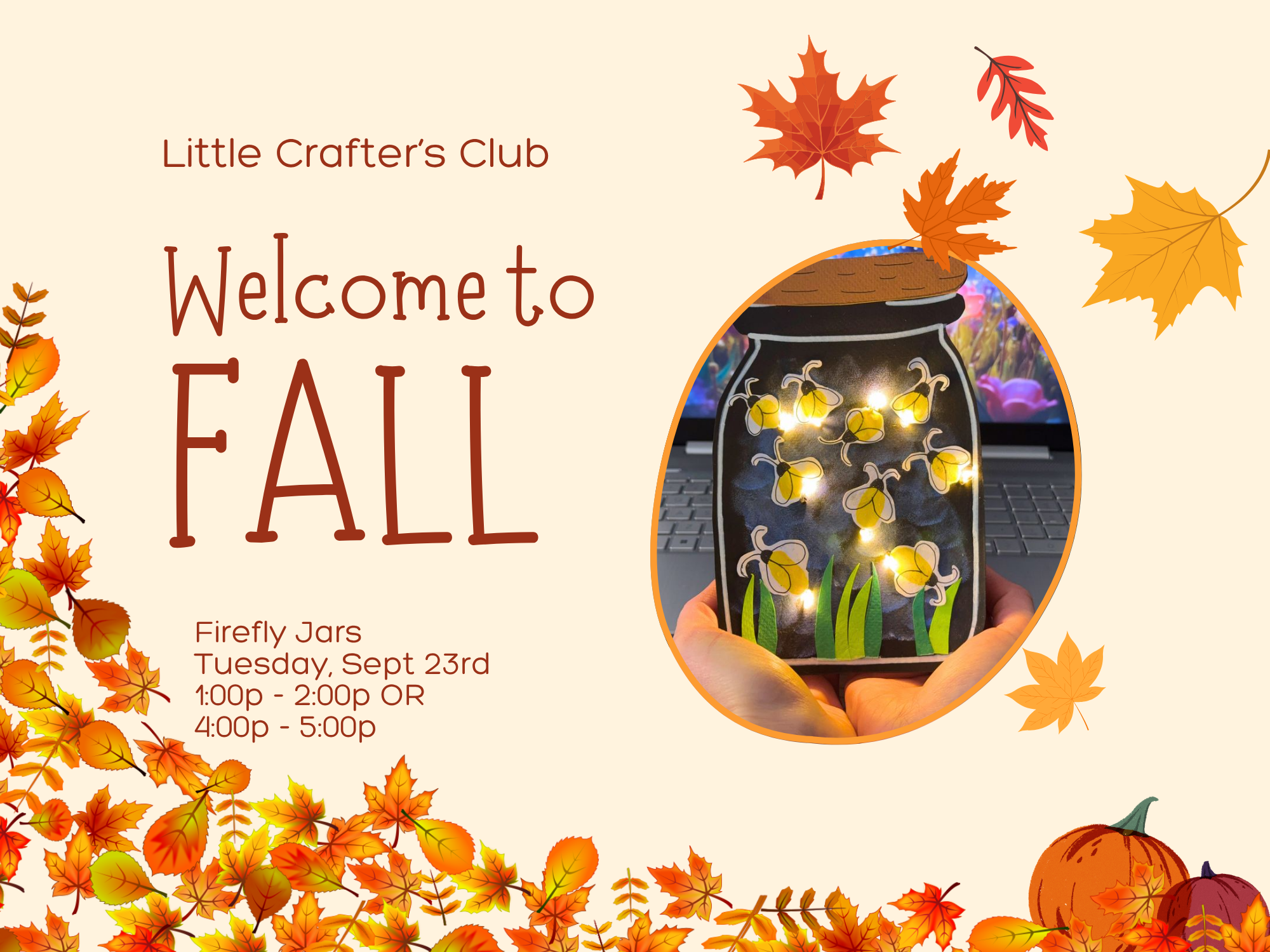 In this class, crafters will create "jars" full of fun glow-in-the-dark fireflies! Due to limited space, this is a drop-off class for crafters ages 4-10. Be sure to check out the Welcome to Fall Bundle for a discount on all 5 Welcome To Fall classes.