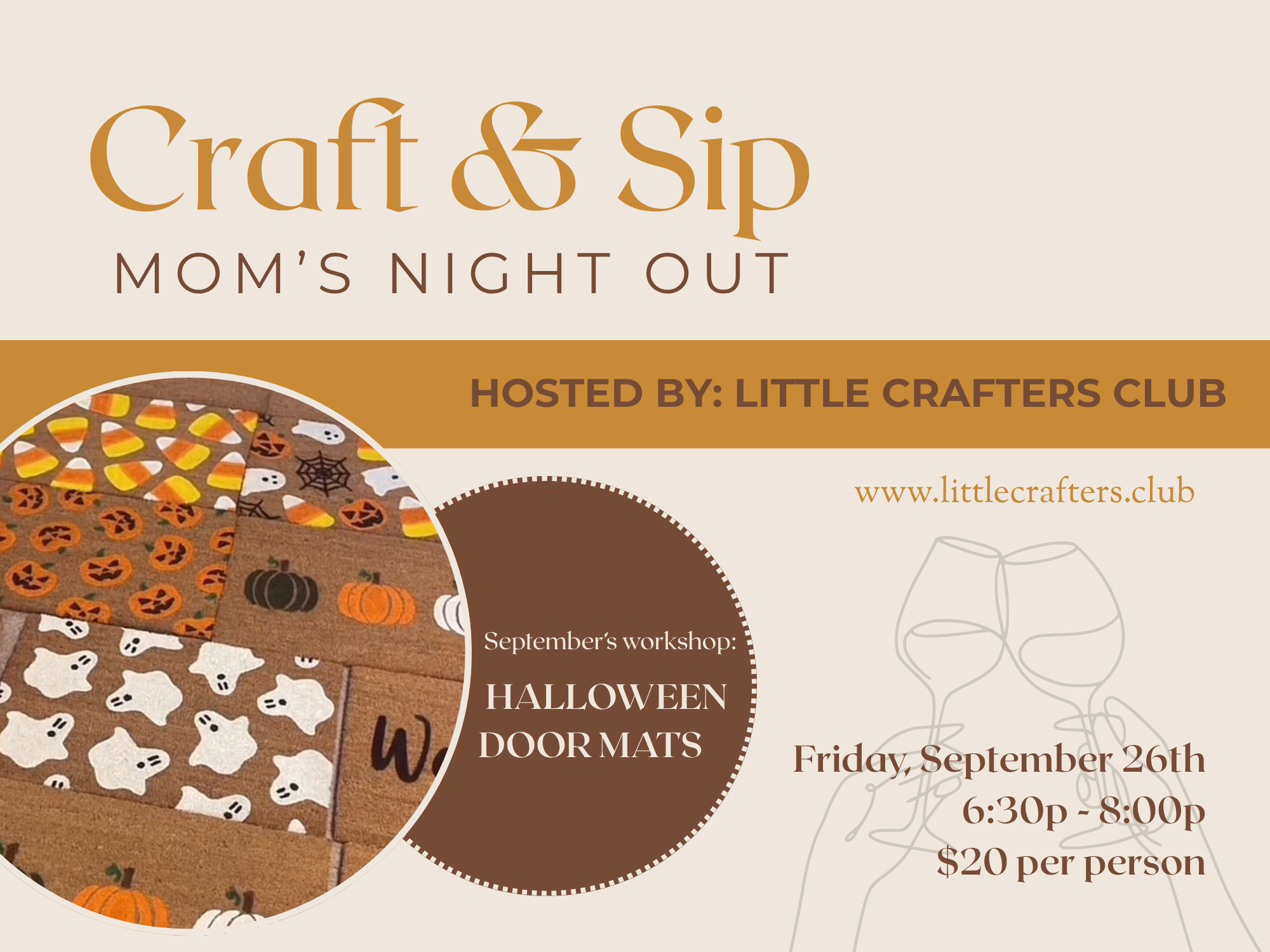Moms, this one's for you! Enjoy a quiet night out on your own or bring your friends and make it a girl's night! This month, we'll be making Halloween welcome mats, perfect for your front door during spooky season. All supplies are included. This is a BYOB event.