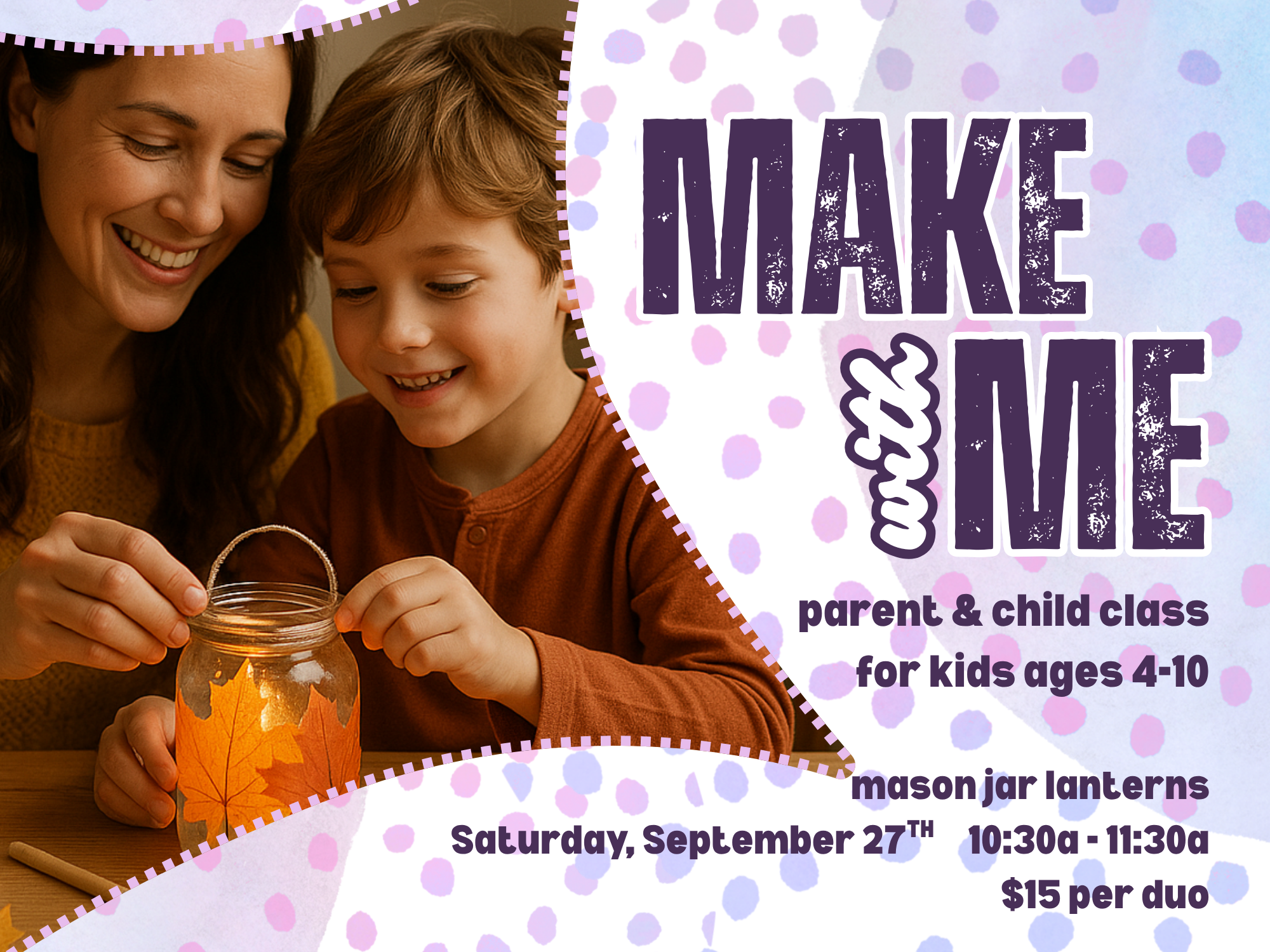 Come craft a set of custom fall lanterns with your little crafter! This class is a great way to spend some time together and take home something extra special to display at home. This class is for crafters ages 4-10.