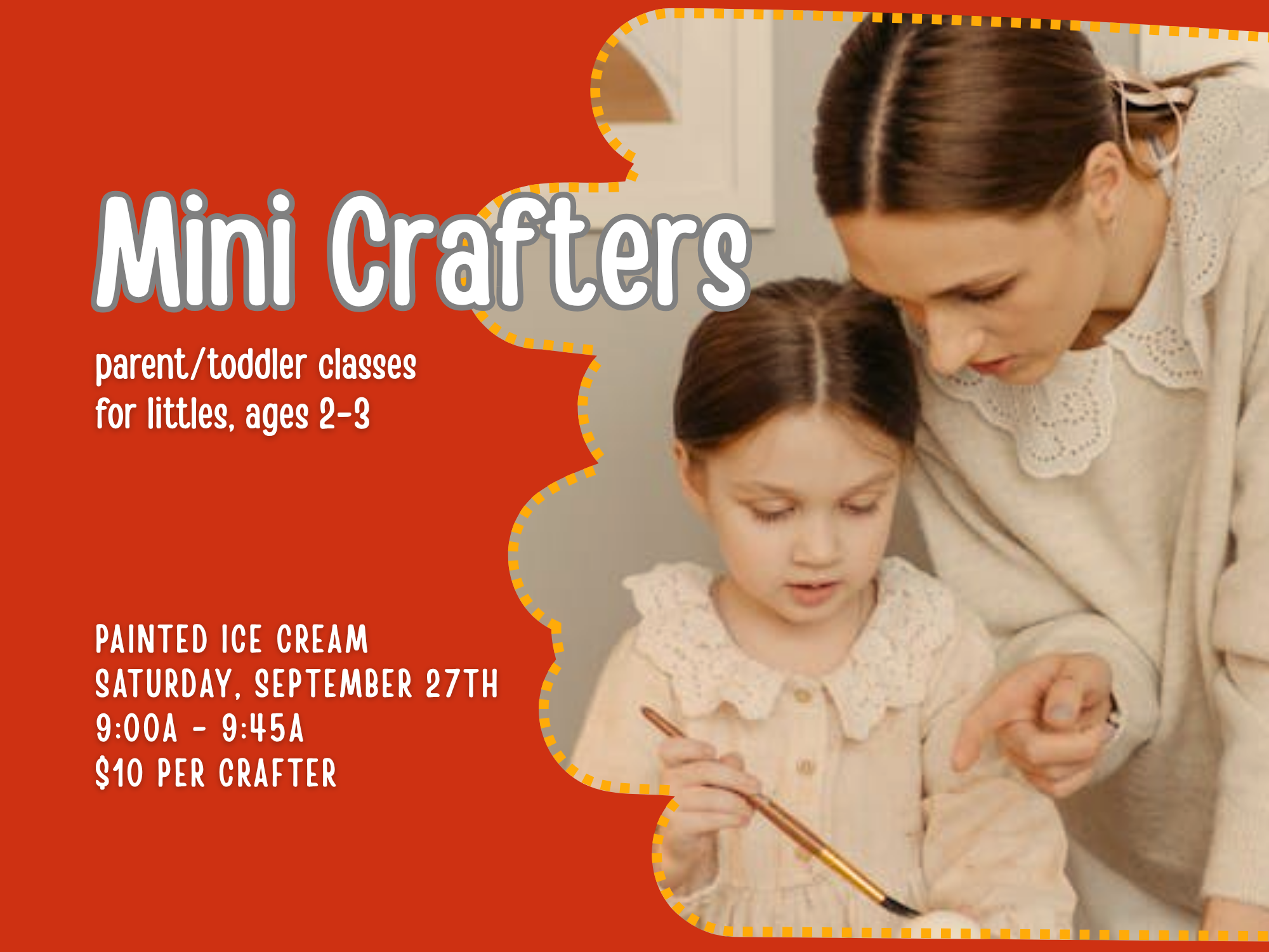 Looking for some bonus time with your littlest crafter, minus the cleanup? Look no further than our fun ice cream painting class! Crafters can experiment with patterns, color mixing, or just messy fun! This class is aimed at crafters ages 2-3.