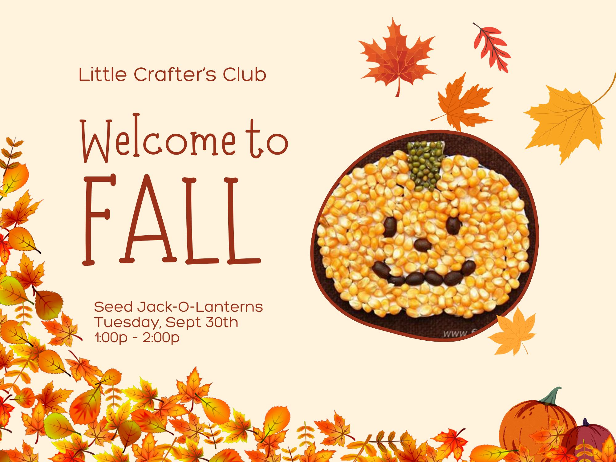 In this class, crafters will put together jack-o-lanterns from various seeds/beans just in time for spooky season! Due to limited space, this is a drop-off class for crafters ages 4-10. Be sure to check out the Welcome to Fall Bundle for a discount on all 5 Welcome To Fall classes.